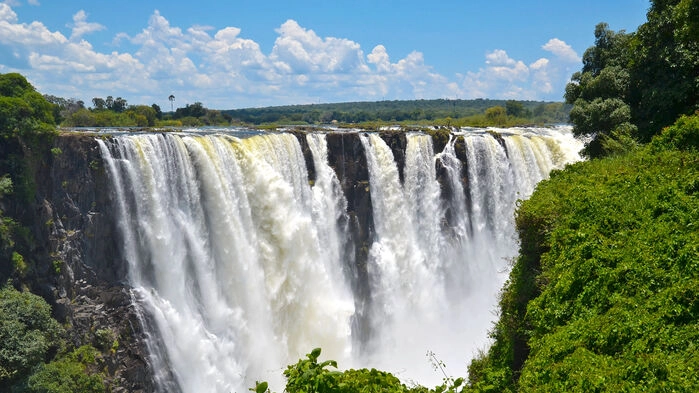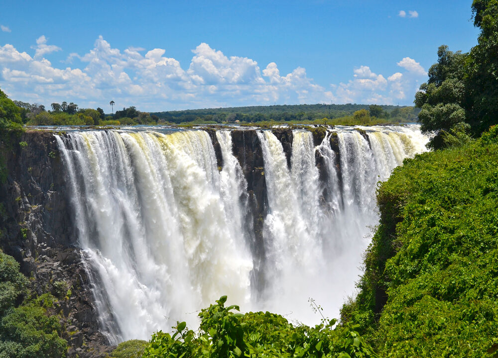 . Efter pass och visumformaliteter väntar transfer till hotellet inne i staden. Vi rekommenderar att man köper ett visum med två inresor redan vid ankomst, då gränsen korsas två gånger. Redan på eftermiddagen är det dags för ett besök vid de mäktiga Victoriafallen, ett av de största vattenfallen i världen. Ljudet av vattenmassorna blir starkare ju närmare vi kommer och molnet som bildas av vattenångorna syns på långt håll. Middagen serveras under en kryssning på Zambezifloden i solnedgången.