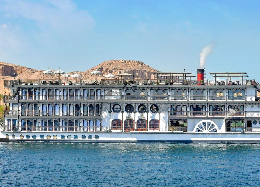 Vi flyger till Luxor där Nilen glittrar mellan gröna fält, palmer och gyllene ökenklippor. Vid kajen väntar vårt fartyg – SS Misr – en gång kung Farouks stolthet, nu varsamt återställd till sin ursprungliga elegans. Ombord doftar det av trä, linne och polerad mässing, och floden ligger stilla som en spegel under oss.
