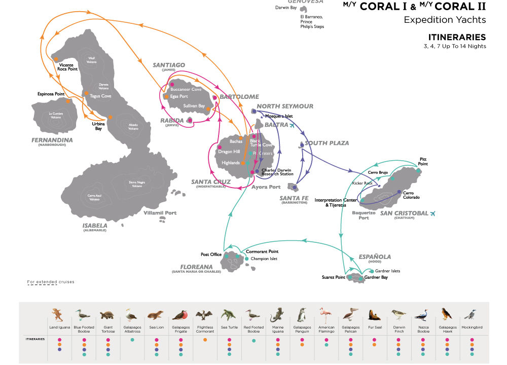 Avgång från Quito eller Guayaquil med morgonflyg till Galapagos och ön Baltra. Flygningen tar cirka 2,5 timme. Vid ankomst möter rederiets naturistguide för vidare transport till M/Y Coral I eller M/Y Coral II.