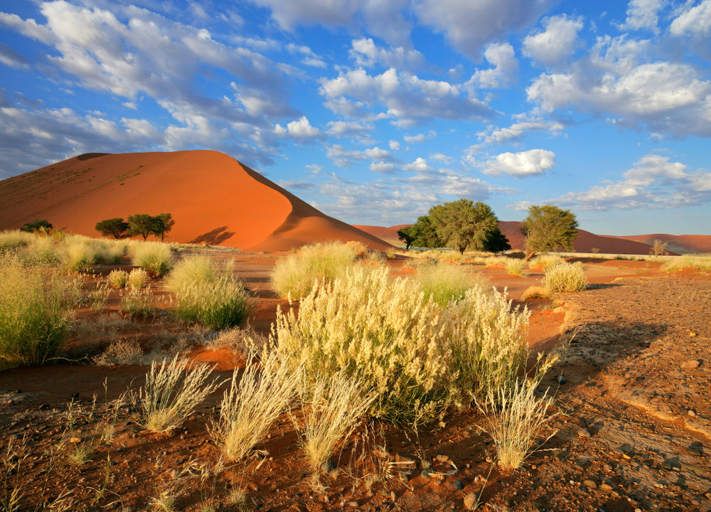 Äventyret i Namibia inleds med flyg till Namiböknen, världens äldsta öken. De röda, upp till 300 m höga sanddynerna är magnifika och ändrar ständigt färg och form, beroende på vindar och ljusförhållanden. Lodgens safaritält har privata verandor med vidsträckt utsikt. I den torra öknen har många djurarter anpassat sig till omgivningarna, t.ex struts, springbok och schakal. På eftermiddagen kan det vara skönt med ett dopp i poolen medan ni spanar efter djur som kommer för att dricka vid vattenhålet. Njut av Namibias traditionella "coffee cake" och en sundowner i solnedgången innan middagen.