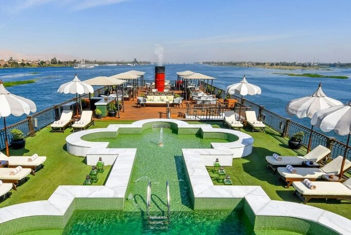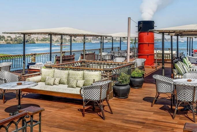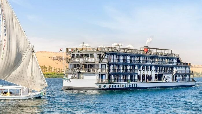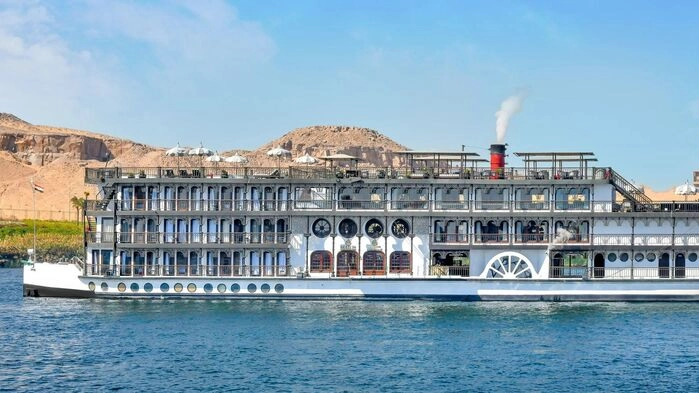 Vi flyger till Luxor där Nilen glittrar mellan gröna fält, palmer och gyllene ökenklippor. Vid kajen väntar vårt fartyg – SS Misr – en gång kung Farouks stolthet, nu varsamt återställd till sin ursprungliga elegans. Ombord doftar det av trä, linne och polerad mässing, och floden ligger stilla som en spegel under oss.
