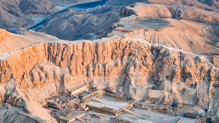 Gryningen över Luxor är stilla och klar. Vi korsar Nilen till den västra stranden, där öknen möter bergen i ett...