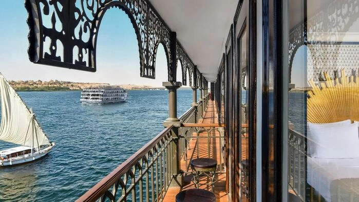 Vi flyger till Luxor där Nilen glittrar mellan gröna fält, palmer och gyllene ökenklippor. Vid kajen väntar vårt fartyg – SS Misr – en gång kung Farouks stolthet, nu varsamt återställd till sin ursprungliga elegans. Ombord doftar det av trä, linne och polerad mässing, och floden ligger stilla som en spegel under oss.