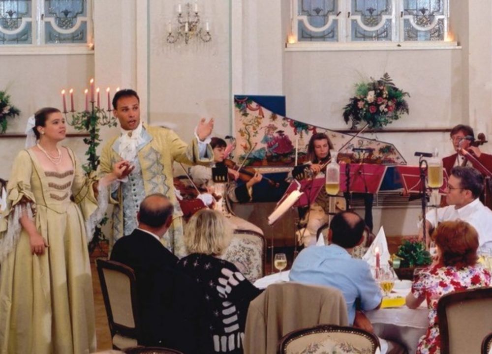Ikväll skall vi uppleva Mozarts musik i en 1700-talsmiljö där han själv tillbringade tid med familj och vänner. Stiftskeller St. Peter finns omnämnd i ett dokument från år 803 och anses vara den äldsta ännu fungerande krogen i Europa. Barocksaal står uppdukad till fest och belysningen med levande ljus skapar en härlig stämning och atmosfär som minner om svunna tider. Vi serveras en trerätters meny tillagad efter den tidens recept med måltidsdryck. Under middagen underhåller musiker och solister i tidstypiska kläder med musik hämtad ur Mozarts rika produktion, t.ex. Don Juan, Figaros bröllop och Trollflöjten. Vi har bra platser och vid ankomsten får vi program för kvällen och serveras en välkomstdrink. Kvällen avslutas vid 23-tiden då bussen tar oss till hotellet.