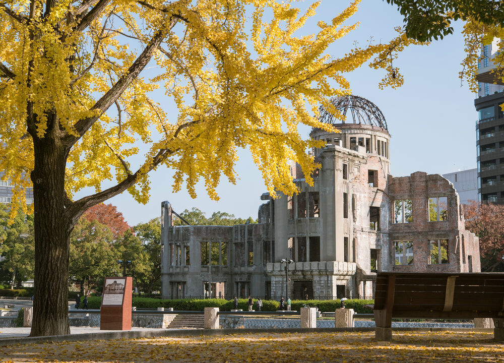 Vi gör också ett fotostopp vid Atomic Bomb Dome, en byggnad som har bevarats som ett kraftfullt monument över Hiroshimas historia och motståndskraft.