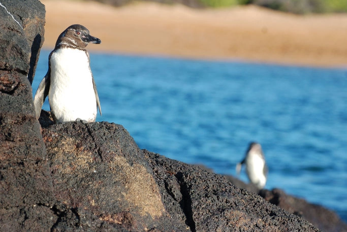 På förmiddagen blir det en så kallad våt landstigning, vilket innebär att man med små båtar tar sig så nära stranden som möjligt och vadar in den sista biten. Här väntar en Galápagosikon, Bartolome! En tur uppför trätrappan till utsiktspunkten är väl värt besväret. Man kan åka med gummibåtarna kring Pinnacle Rock, besöka stranden för ett dopp och snorkling där kanske revhaj, havsköldpadda eller galápagospingvin ses. Övriga typiska öbor är blåfotad sula och havsleguan. Santiago-ön har ett geologiskt intresse med omfattande lavaflöden som bildades slutet av 900-talet och vi kan se växter tränga upp ur sprickorna. Att gå på den stelnade lavan ger intrycket av att vara på en annan planet.