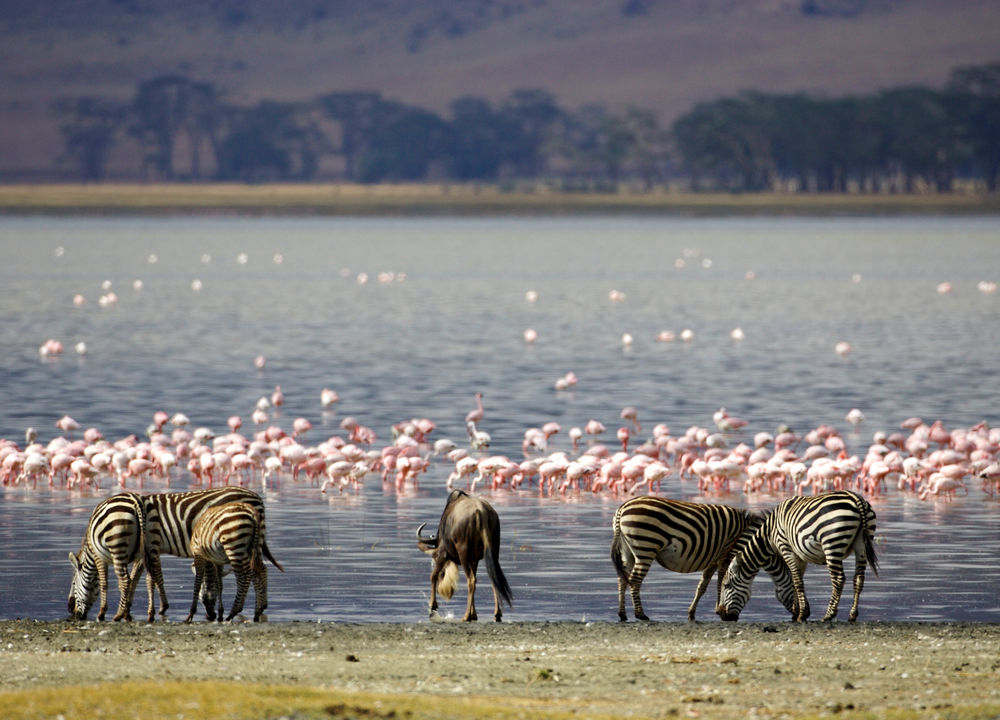 Turen går ner i kalderan, som är den kraterliknande formation som skapas när en vulkan kollapsar. Förmiddagen tillbringas på safari. Mitt i kalderan finns en sjö som ofta besöks av flamingor och sjöns stränder böljar därför i rosa nyanser. Vilda djur av alla slag lever här i full frihet. Vi har till och med chans att se den sällsynta svarta noshörningen. Åter på lodgen vid lunchtid. Resten av eftermiddagen är fri för egna aktiviteter. Pool finns. Det går även att besöka en närbelägen massajby (cirka 25 USD/pers.). Övernattning på lodgen, belägen på kraterkanten.
